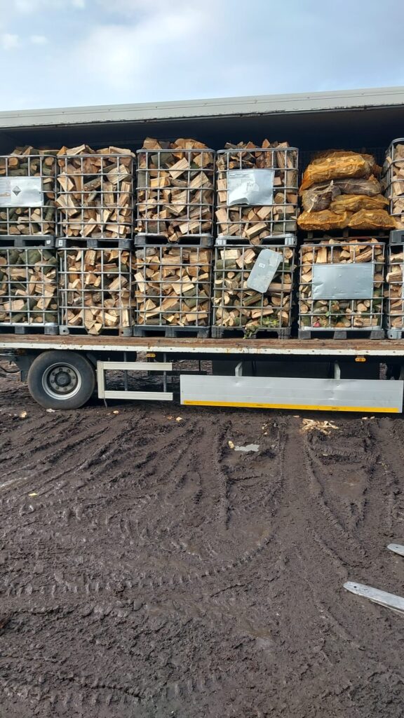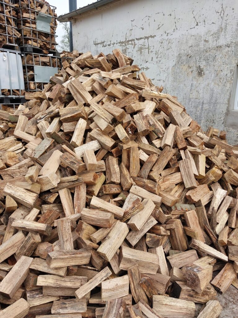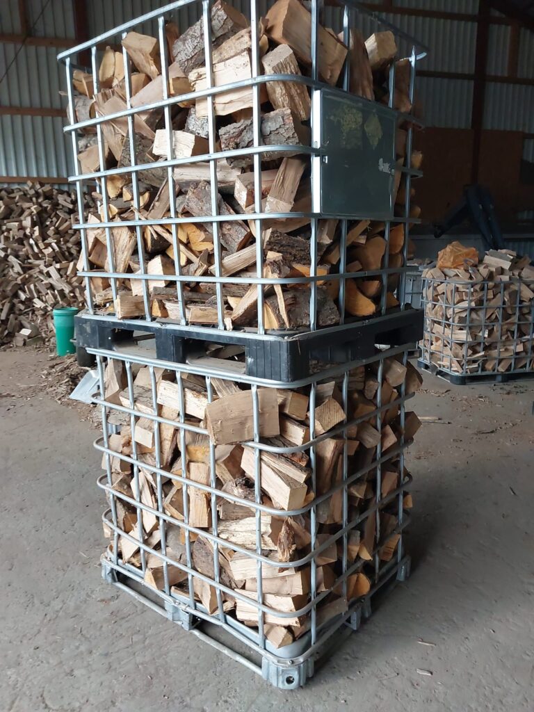 Ein großer Teil unseres Kaminholzes wird in luftdurchlässigen Gitterboxen gelagert und auf natürliche Weise von Sonne und Wind getrocknet.